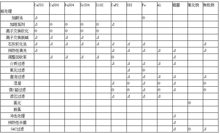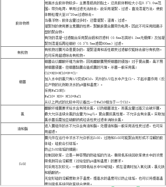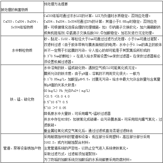膜的污染、堵塞和侵蚀性因素包括结垢物、金属氧化物、悬浮物和胶体、有机物、生物污染等,所采取的措施主要是经典常规的水处理方式,但要求比较严格。反渗透给水预处理方法概要如表6-2所示。