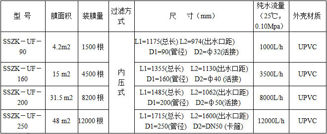 为满足各种不同用户及不同水处理吨位的需要,现提供直径为 10英寸、8英寸、6英寸和 4英寸多种规格的膜组件。10英寸膜组件长度是 60英寸,6英寸和 4英寸的均是 50英寸。直径为10英寸、6英寸的膜组件,外壳采用了耐压耐腐蚀的PVC。